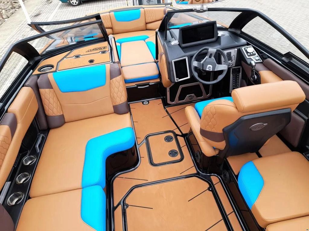 Turn heads and turn up the performance with this 2021 Malibu M220, a true luxury wake machine with only 41 hours of use and full official dealer service history. This boat is finished in an eye-catching Vapor Blue Metallic and Ebony exterior, paired with a rich and stylish Sepia Brown interior accented by Vapor Blue—a stunning combination of elegance and edge.